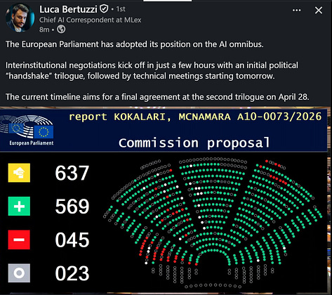 The European Parliament just adopted its position on the Digital Omnibus on AI. Trilogue negotiations start today. The current timeline targets a final agreement on April 28.