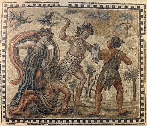Mosaic, 4th century CE, from Villa Ruffinella Area in Tuscolo. Museo Nazionale Romano a Palazzo Massimo, Rome.