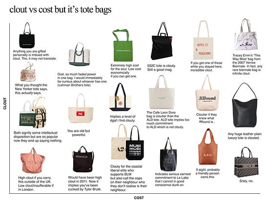 "A niche tote is an extremely potent and powerful signal of cultural currency which, in most cases, costs little or nothing. A Dior book tote says nothing about your level of access to elite spaces. A rare biennale bag from a few years ago? That's a conversation starter."