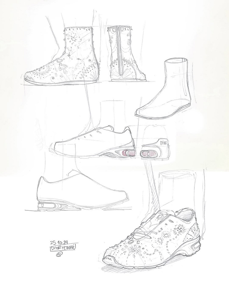 Nouarre’s design process of the Dior O.D.C sneakers by Kim Jones, for Winter 2025. An interpretation of the Dior 1961 Roger Vivier heel.