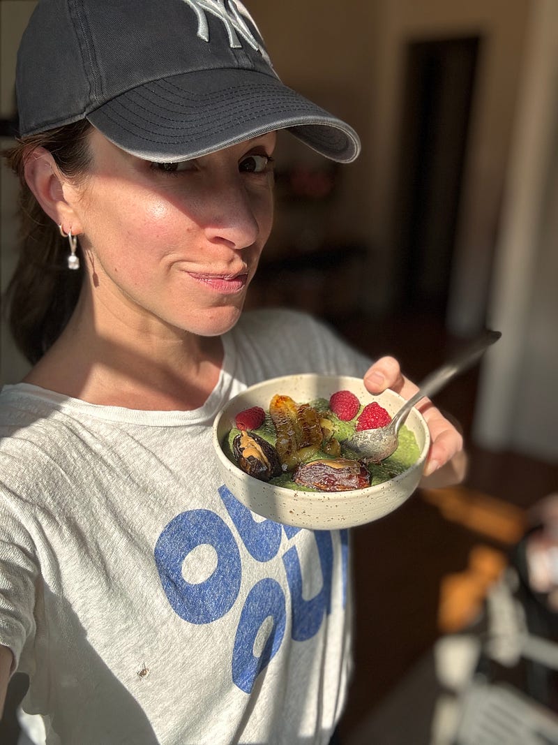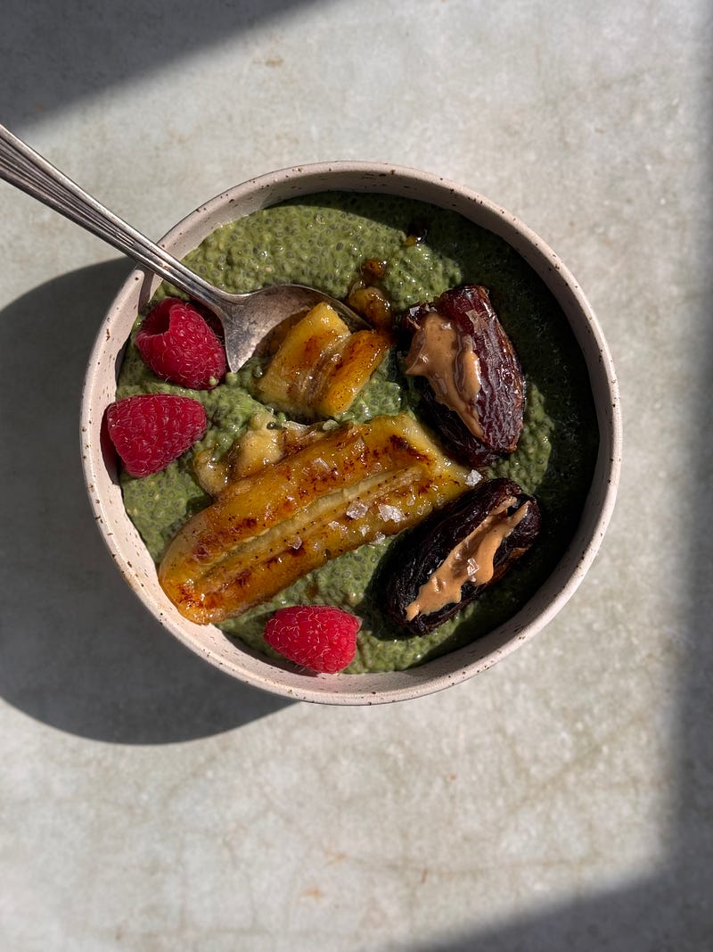 Matcha chia pudding with caramelized bananas, peanut butter dates, raspberries