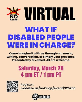 What if disabled people were in charge? Come imagine it with us through art, music, writing, conversation, or simply your presence. Presented by DIYabled. All are welcome. We have the power and are claiming it together. No Thrones. No Crowns. No Kings. What began in 2025 as a single day of defianc…