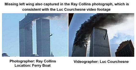 Yet another photograph taken by Ray Collins from the ferry boat that left Battery Park on 9/11 capturing the alleged second aircraft, showing the left wing missing anomaly. This is consistent with a number of other photographs and videos which I and Mathiew Estepho have presented showing the same anomaly with the “alleged” aircraft, and consistent with glitches in the 3D volumetric image projection from differing locations. Remoted controlled military aircrafts which are a physical object do not have their wings go missing.