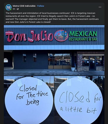 ICE shut down the oldest Mexican restaurant in my hometown of Forest Lake, Minnesota -- a city that voted overwhelmingly for Trump (and Pete Hegseth's hometown too)