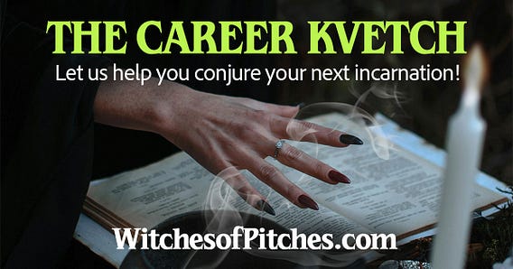 We’re often asked how we got into copywriting, content writing, kid lit, and journalism and decided to add a service to Witches of Pitches called The Career Kvetch. We’ll Zoom with you for 45 minutes to talk about your career, answer your questions, and share our witchy wisdom on networking and breaking into a new area, whether you’re entry level or making a mid-career pivot. Reach out to us at witchesofpitches.com and take advantage of our introductory pricing.