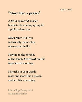 Okay, here’s a lil paint-chip poem I wrote this morning. The paint-chips I drew are bolded and italicized :) Please enjoy this not so good poem and feel free to use the words to write your own!