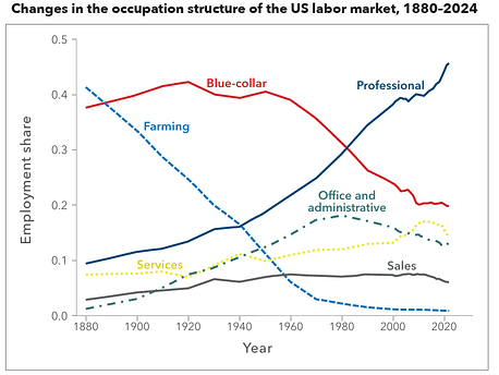 Since the Industrial Revolution, we’ve seen a steady improvement in the quality of jobs. Workers moved from agriculture to manufacturing to services, and have upgraded within these sectors. Eg. secretary jobs have shrunk as a share of service employment in recent years, while consulting jobs have grown.