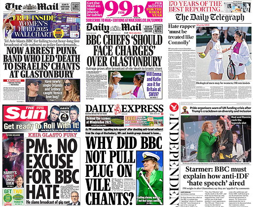 If only there were half the outrage over Israeli soldiers shooting starving people queuing for food as there has been towards some rappers mouthing off at Glastonbury, we'd be in a very different place