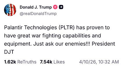 Trump praises Palantir for its “proven” “great war fighting capabilities and equipment” and provides its Nasdaq stock ticker