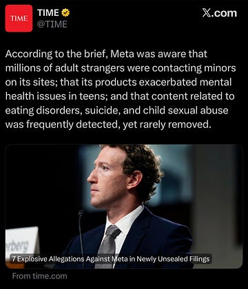 Imagine knowing your platform was a playground for predators, fueling teen depression, eating disorders, and suicide and deciding the best course of action was… absolutely nothing. Meta didn’t just “miss” anything. They saw it. They measured it. They reported it internally. And then they kept cashing the checks. If this happened anywhere else in a school, a company, a damn bowling alley people would be in handcuffs. But Silicon Valley executives get hearings, PR statements, and another quarter of profits. Kids were the product. Safety was the afterthought. Accountability is long overdue.