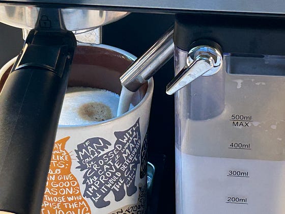 So, we went all out and bought this thing. It makes cappuccinos and lattes. And espresso. I figure it’ll save us between $12,000-$18,000 a year