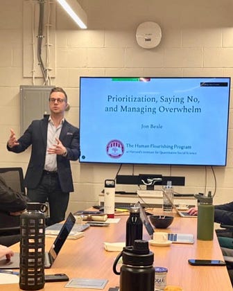 Had a great time giving a couple of talks at Harvard recently, on “Flow States and Human Flourishing” and “Prioritization, Saying No, and Managing Overwhelm”.