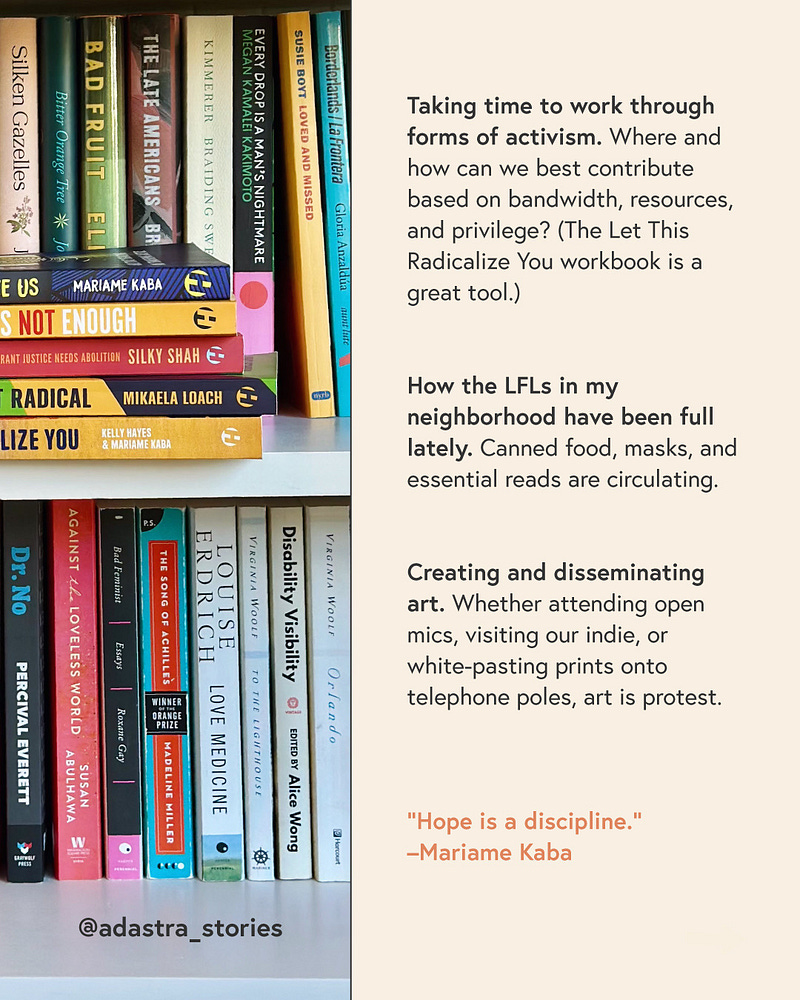 “Hope is a discipline,” as Mariame Kaba says. Hope requires discipline, it demands action. Because hope without either is an empty privilege that affords safety in complacency.