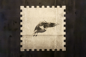 My studio is in a basement with cement walls. I used an opaque projector to shine this seagull against the texture. The stamp shape is something new I’ve been experimenting with.