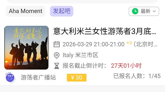 2026年3月底让我们齐聚意大利米兰,共吃美食,共享春日美景,共创美好记忆!游荡者(www.youdangzhe.com)的“活动发起”功能也在农历年的最后一天上线,欢迎大家来到社区广场的“发起吧“多多发起!也祝大家春节快乐!