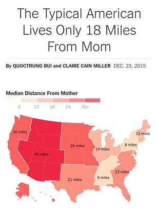 “Over all, the median distance Americans live from their mother is 18 miles, and only 20 percent live more than a couple of hours’ drive from their parents”