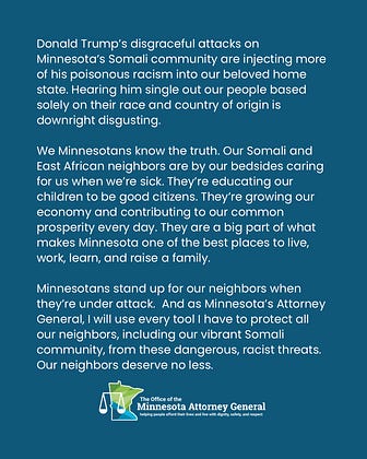 Minnesotans stand up for our neighbors when they’re under attack. And as Minnesota’s Attorney General, I will use every tool I have to protect all our neighbors, including our vibrant Somali community, from these dangerous, racist threats. Our neighbors deserve no less.