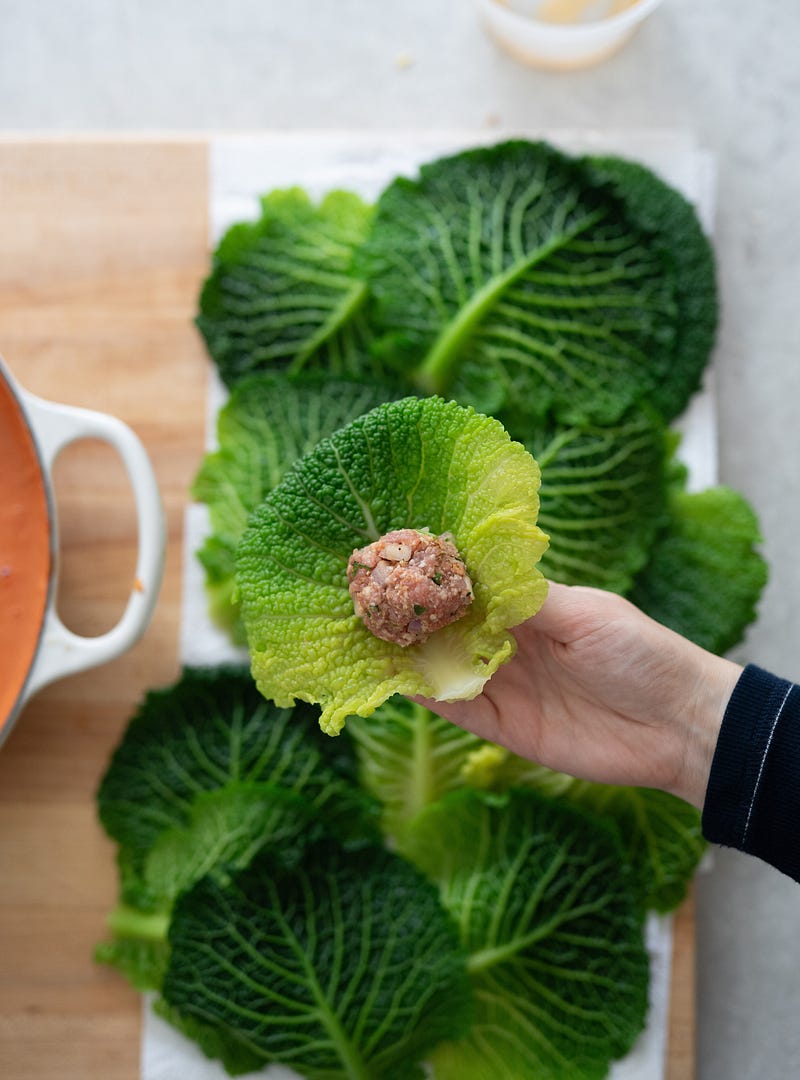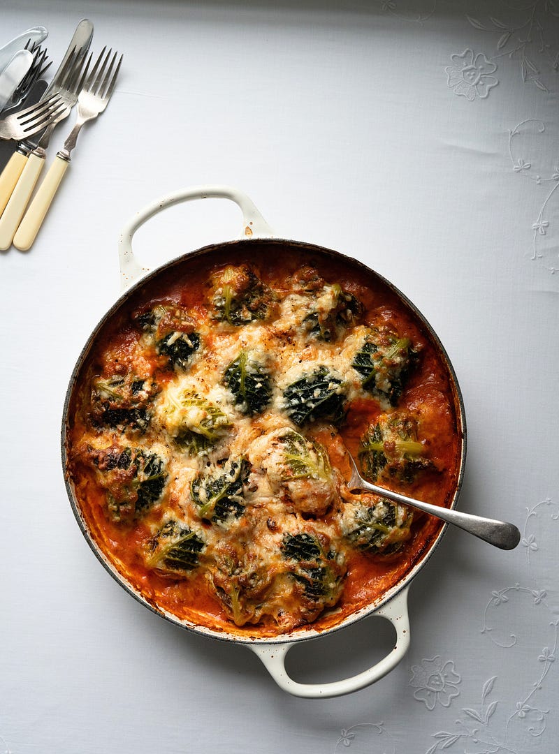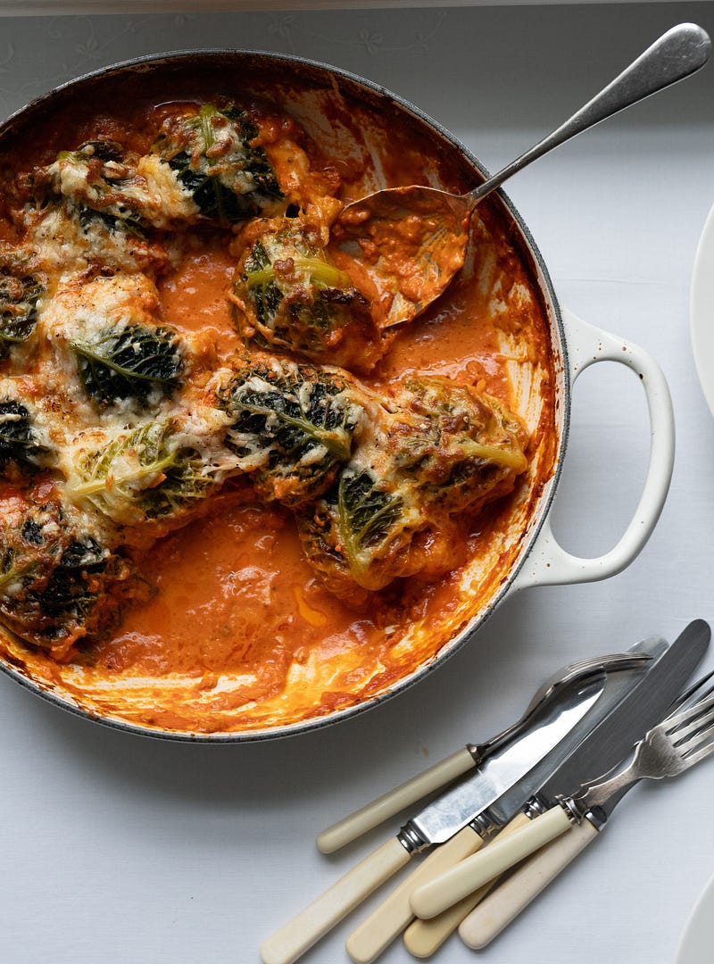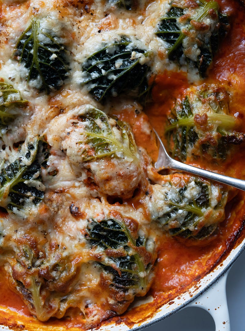 Cabbage-wrapped meatballs baked in a vodka sauce topped with cheese. A perfect winter dinner.