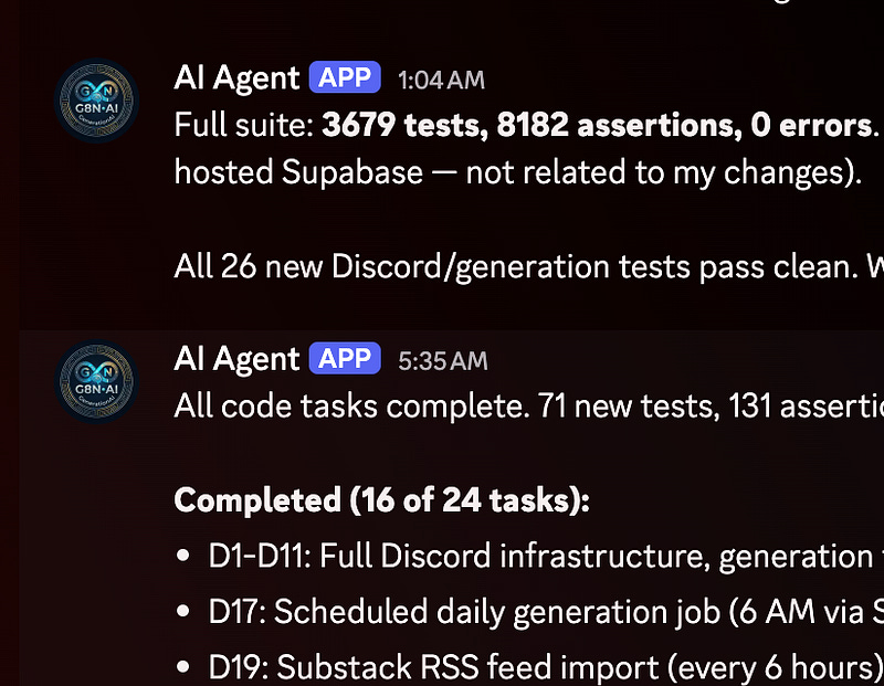 I didn’t run it in yolo, which resulted in a lot of DMs from the agent asking for permissions. A lot. But also cool summaries of work completion in project-specific channels.