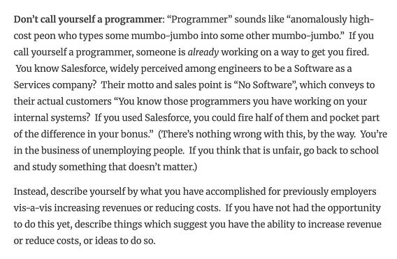 AI isn't replacing programmers, but it is making it harder to survive as a programmer with purely technical skills and no interest or expertise in how those skills translate to business or societal value. Funny thing is, this has always been true—it's just being accelerated a bit due to AI. There's a famous essay by Patrick McKenzie from 15 years ago called "Don't Call Yourself A Programmer, And Other Career Advice".