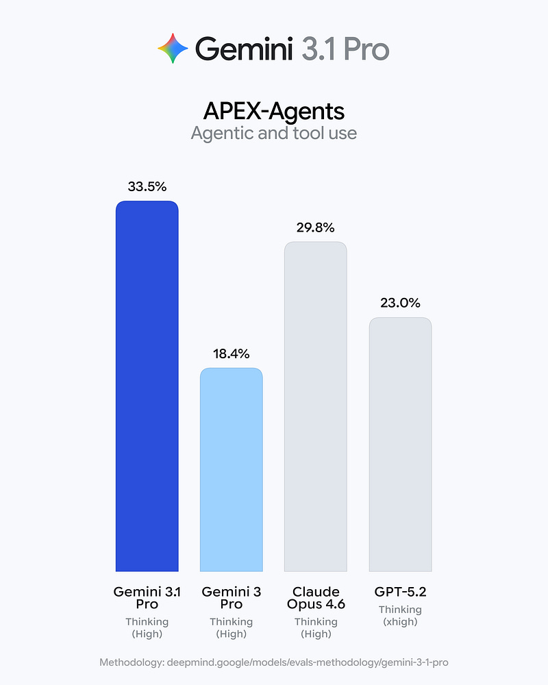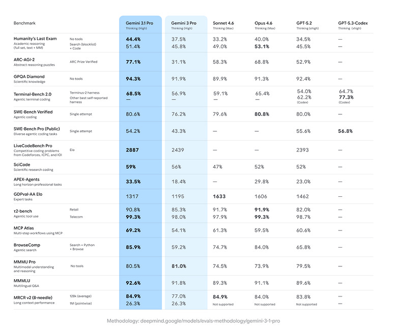 The standout feature of 3.1 Pro is its performance on the ARC-AGI-2 benchmark—a test for abstract logic that's notoriously hard for AI.