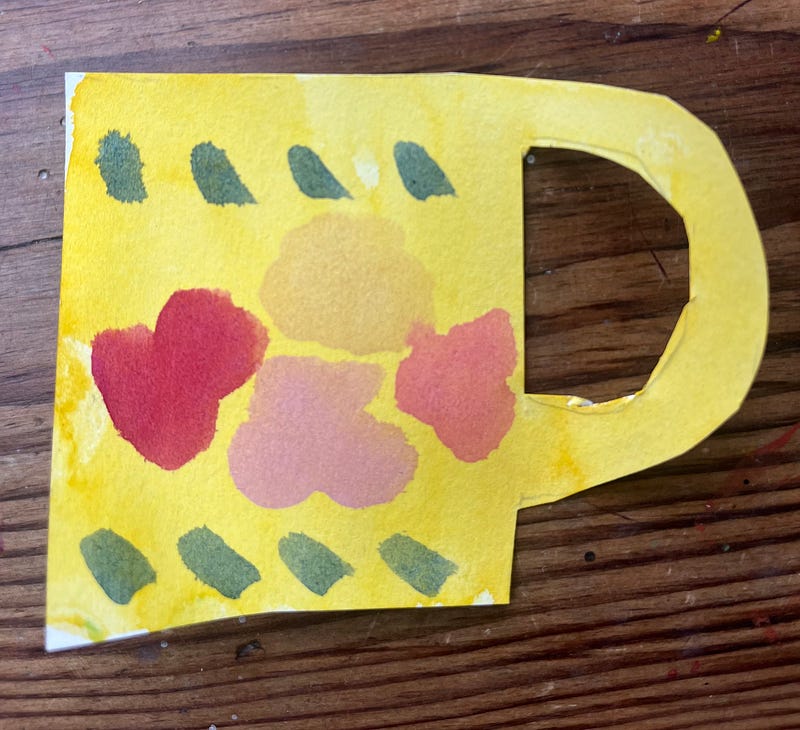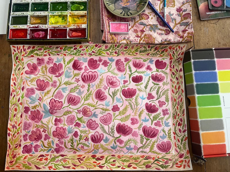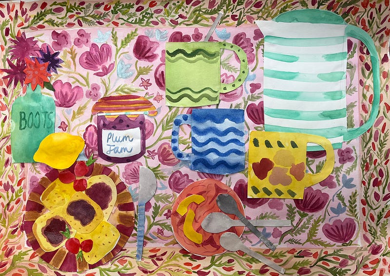 A floral collage on the theme of A Shared Table. Enjoyed painting the block print fabric, inspired by the amazing 17th century botanical sketchbooks I saw last week at The Ashmolean Museum. French toast and Bloomsbury-style mugs are my own additions!