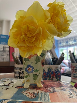 I can’t remember the name of this fluffy daffodil but I want to call it a fluffodil. It looks lovely in the garden, but the stalks do struggle to hold up the big fat heads so I’ve rescued a couple. They’re adorable.