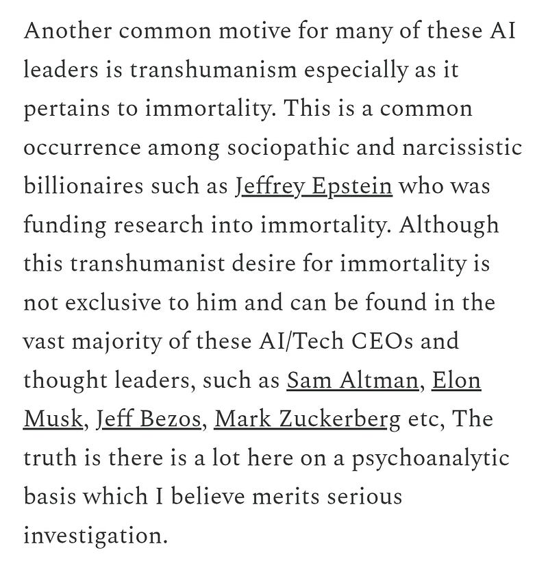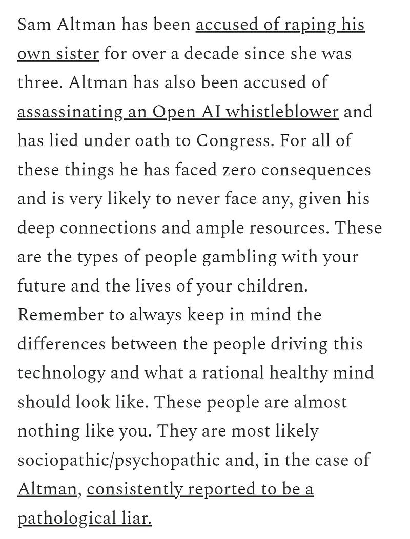 Blog of the guy who threw a Molotov cocktail at Sam Altman's house. Basically a poorly argued retread of standard AI doom arguments coupled with typical rightoid (and in this case, libelous) obsessions with pedophilia, Epstein, transhumanist elites.