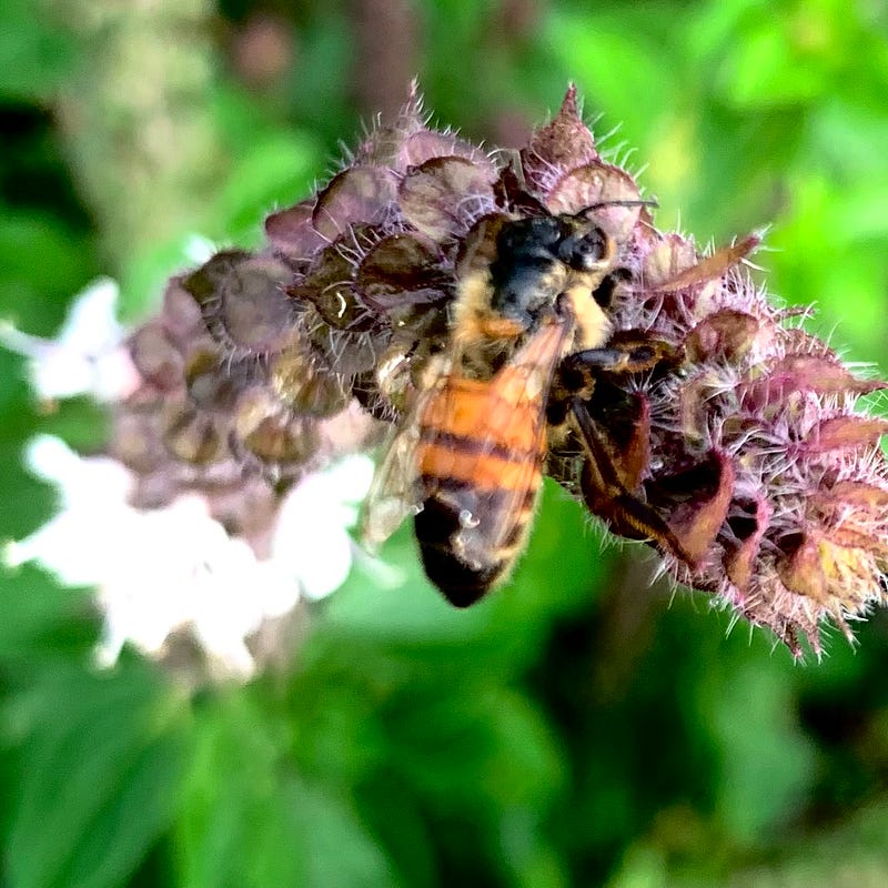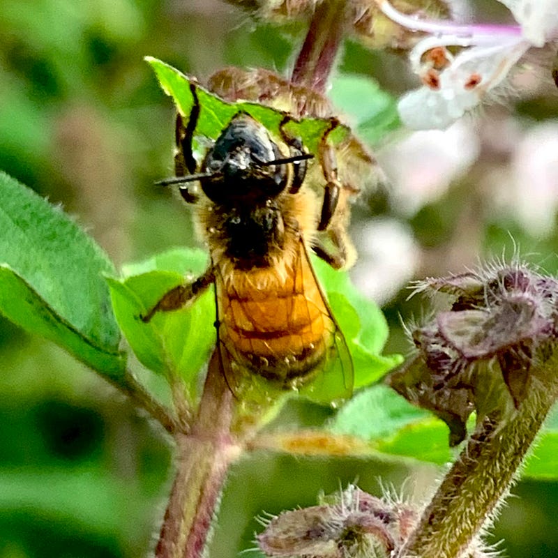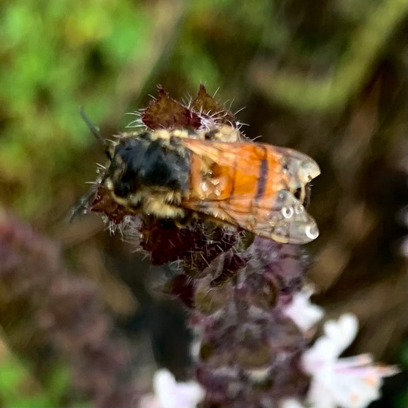 But I became worried when I looked closer and found there were bees stuck to the flowers. Absolutely still, and soaked all-the-way-through, I worried the bees didn’t survive the deluge. Did they drown in the downpour? Did the rain break their wings? Why weren’t these poor little honey bees moving?