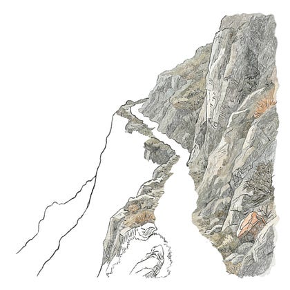 Raramente disegno paesaggi. Di solito disegno persone: corpi goffi, visi insoliti, caratteri ingombranti. Questa scogliera mi sta riposando. Arriverà in un episodio che non è ancora pronto. Per ora esiste solo così, a metà tra il segno e la roccia.