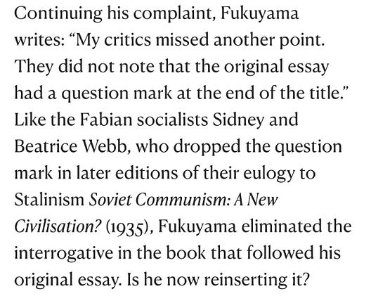 Miniature publishing cliché: the disappearing question mark. A New Civilisation? becomes A New Civilisation, ‘The end of history?’ becomes The End of History….