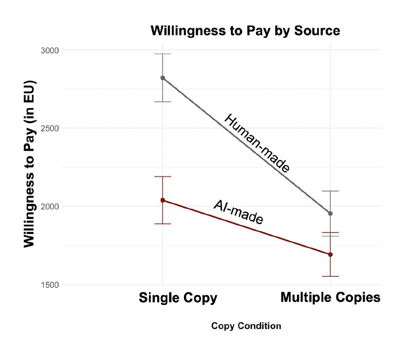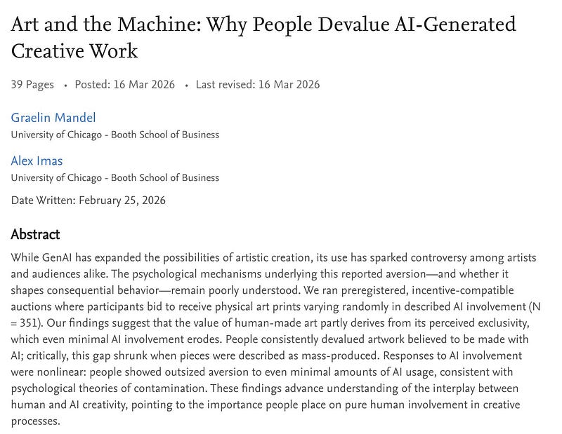 We see this in the data. AI-generated creative work is valued substantially less than human-generated work. And unlike other effects where "people will just get used to it", I think this will be fairly stable: we have way too many previous examples of creative automation to draw on.