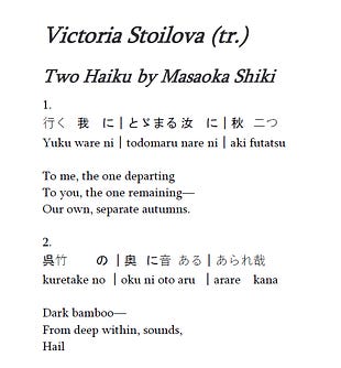 A translation by Victoria Stoilova of two haiku by Masaoka Shiki (1867-1902), from the March 2026 issue of PFPOI. Read the whole issue and download a free, shareable PDF at the link.