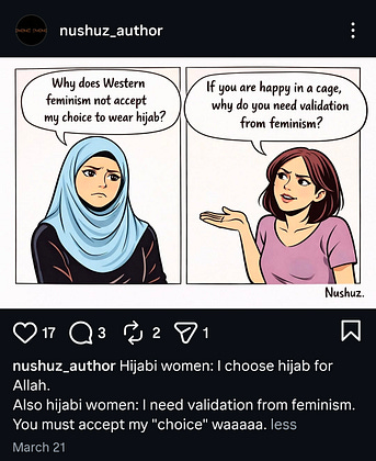^since I am restacking this ill make my position clear for my other viewers, patriarchy and misogyny exist. muslim men also need to understand their epistemic limitations. We do not know what the lived experience of a muslim women is. They have every right to speak on what their rights are and how they are being mistreated within a given society or culture, and men need to respond with empathy, on equal grounds, and take every possible effort in this regard. And also dudes need to have some humility, for Gods sake.