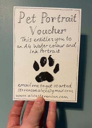 I have finished all my commissions for the year, but you can purchase a voucher for a bespoke commissioned painting which I will post to you in the UK if you order it before Saturday, or I can email it as a printable PDF before Christmas Eve.
