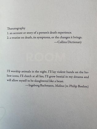 The way my heart flips when Yanara Friedland opens her lustrous THANATOGRAPHIES with an epigraph from Malina— and an unintended palimpsest. 🖤