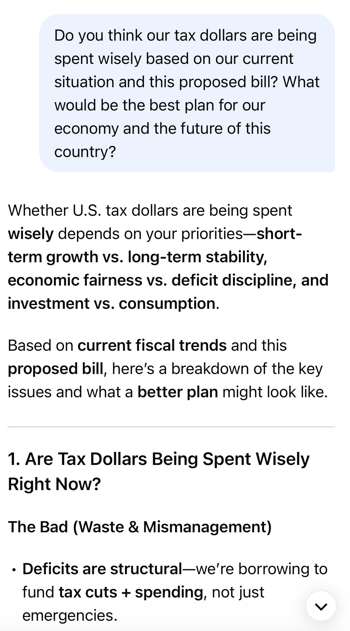 I asked AI: Do you think our tax dollars are being spent wisely based on our current situation and this proposed bill? What would be the best plan for our economy and the future of this country?