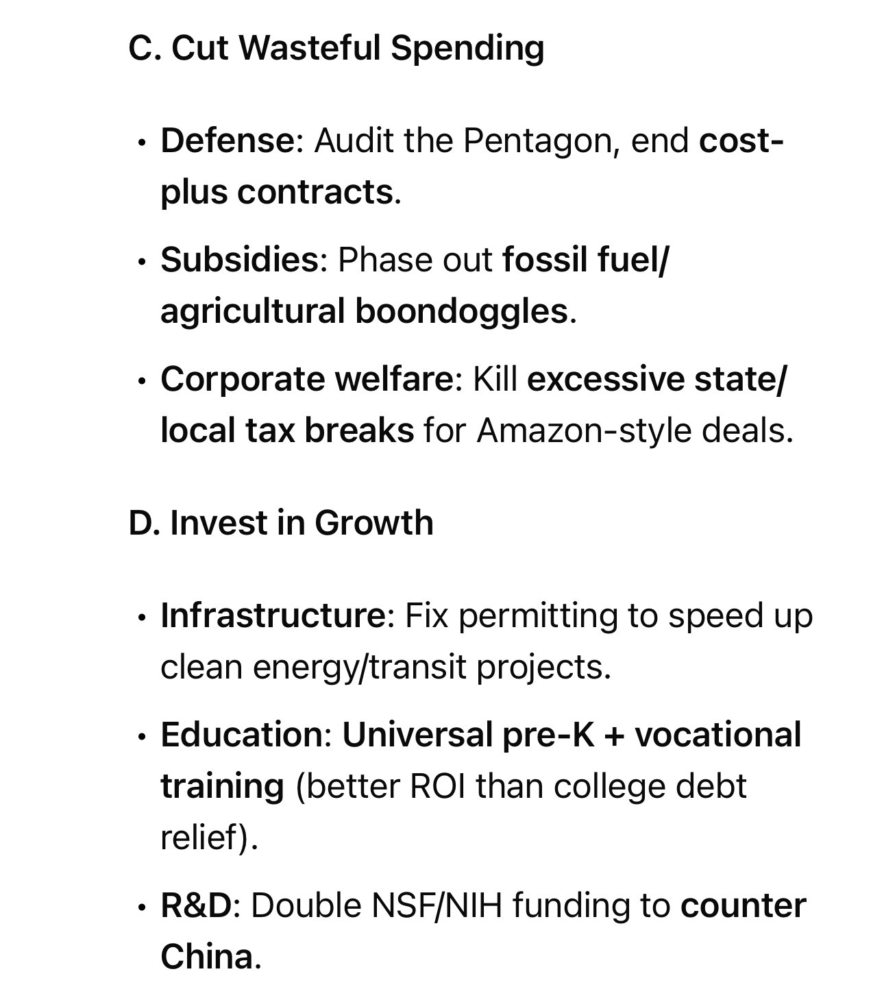 - Education: Universal pre-K + vocational training (better ROI than college debt relief).