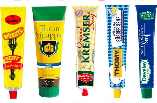 my greatest learning while researching mustard packaging this week is that there is an abundance of mustard sold in cute tubes and I don’t live somewhere where said cute tubes are sold! european friends, are we missing out?