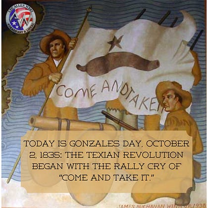 Today is #Gonzales Day, October 2, 1835: The Texian Revolution began with the rally cry of “Come and Take It . . . " #Texas