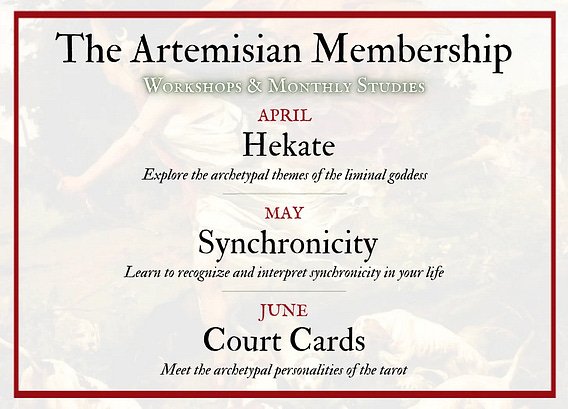 One thing that makes The Artemisian membership unique is its weaving of multiple traditions. Rather than focusing on a single one (like tarot or dreams), we move between several modalities, illuminating the archetypal landscape and symbolic language that unites them all.