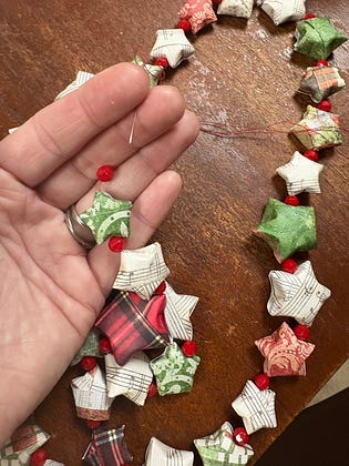 Making a fun little paper garland with origami stars, thrifted beads and needle and thread. π