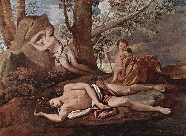عقاباً لغطرسته، جعلته الآلهة يرى صورته في بركة ماء صافية.