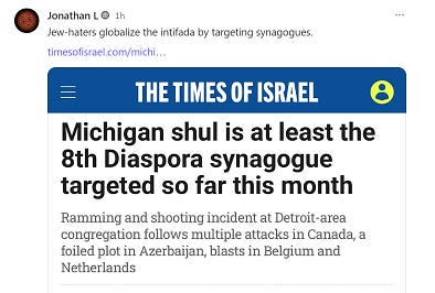 Get a load a’ this Substack kike…“Jew-haters”. Turns out the shooter at Michigan’s Temple Israel synagogue was from Lebanon and two of his brothers there had just been killed by Israel’s invasion. Cry, Jew, cry.