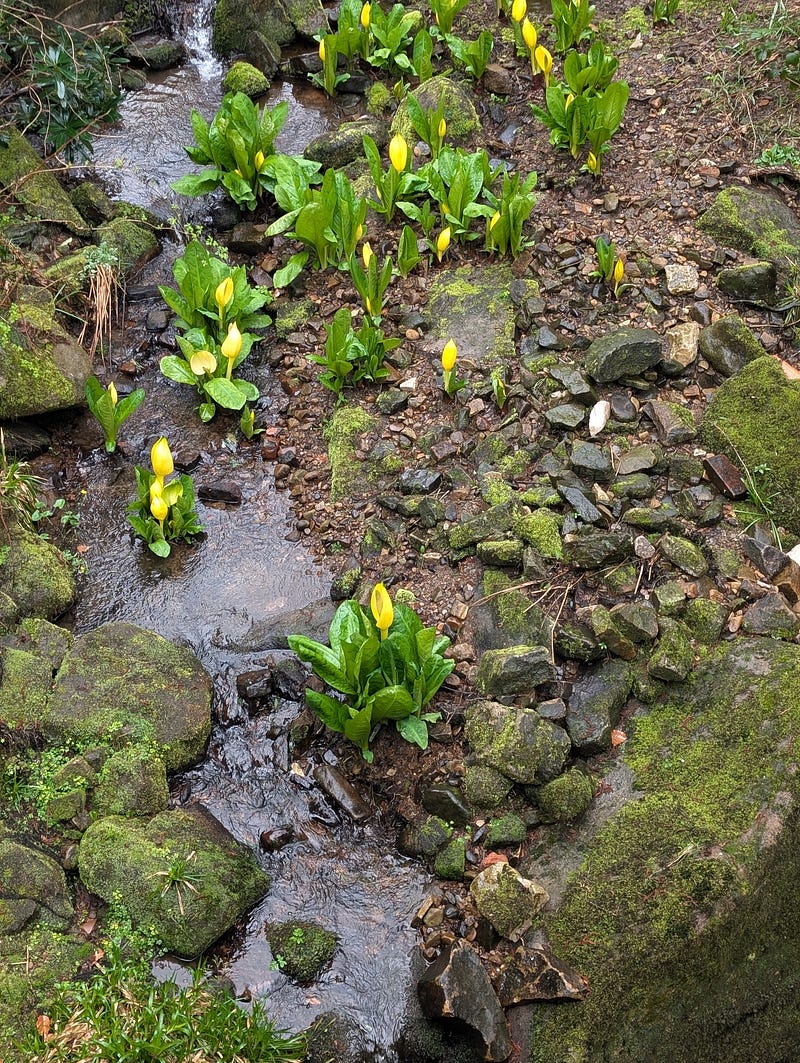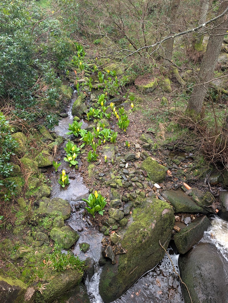 A bit of sleuthing uncovered that they're American Skunk Cabbage, an invasive species. While having pretty flowers, they’re something you definitely don't want to stop and sniff 🦨🤢