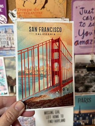 Big thanks to Shannon for this gorgeous San Francisco postcard—it’s the latest gem on my ever-growing postcard wall. We were chatting on her podcast Mixtape Travels when I confessed my quirky little habit: I mail myself postcards when I travel solo. Yep, future-me loves getting snail mail from adventurous past-me.
