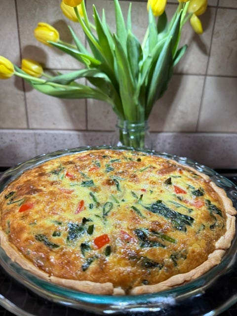 During the Spring one of my favorite things to make for an easy supper is quiche. The basic recipe is below, and I change it up all of the time depending on what I have in the fridge.
