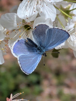 Stunning capture of the Spring Azure butterfly nectaring on Methley plum in my orchard. You can learn more about growing plums for our bioregion and learn host plants for these butterflies on my substack. Happy spring!