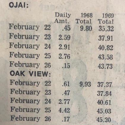 "On January 19th (1969), Ojai’s season total was six inches (of precipitation). In eight days two major storms dumped 24 inches and resulted in the valley being declared a national disaster area… That was a prelude to this week. Nine inches in the valley and up to 15 inches in the mountain ranges… Of the 44 inches of rain this year, 38 fell in the past four weeks… an amount not recorded since the valley was settled over a hundred years ago.”
