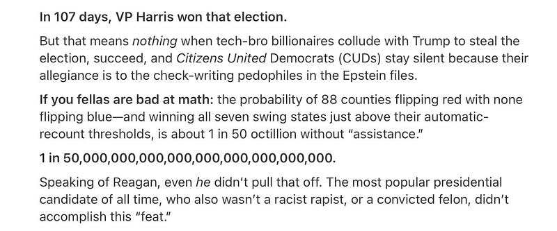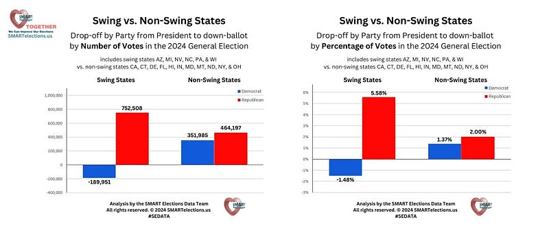 Then, look at all the weird election statistics, like how the swing States had totally different results to States adjoining them with similar demographics.